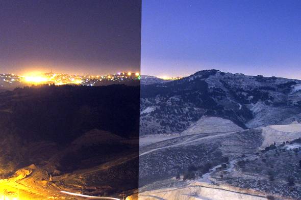 הניף של ירושלים ממעלה אדומים לפני (ימין) ובאמצע (שמאל) הליקוי.